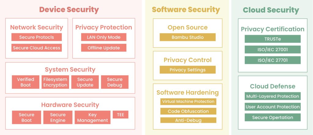 Todos os dispositivos Bambu Lab se comunicam usando protocolos criptografados, incluindo HTTPS, MQTTs, DTLS e WPA2-Enterprise Wi-Fi, enquanto um modo somente LAN opcional permite que os usuários desabilitem toda a conectividade externa para impressão offline. O firmware também pode ser atualizado através da instalação offline de cartão SD, mantendo o isolamento para usuários que preferem operação totalmente native.