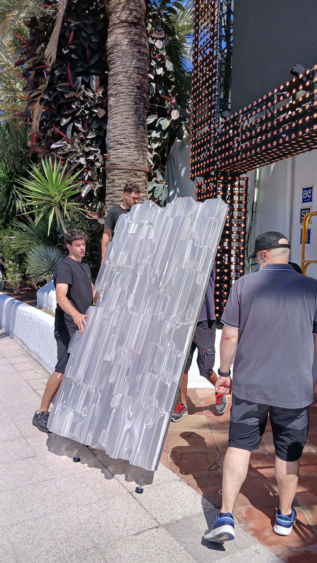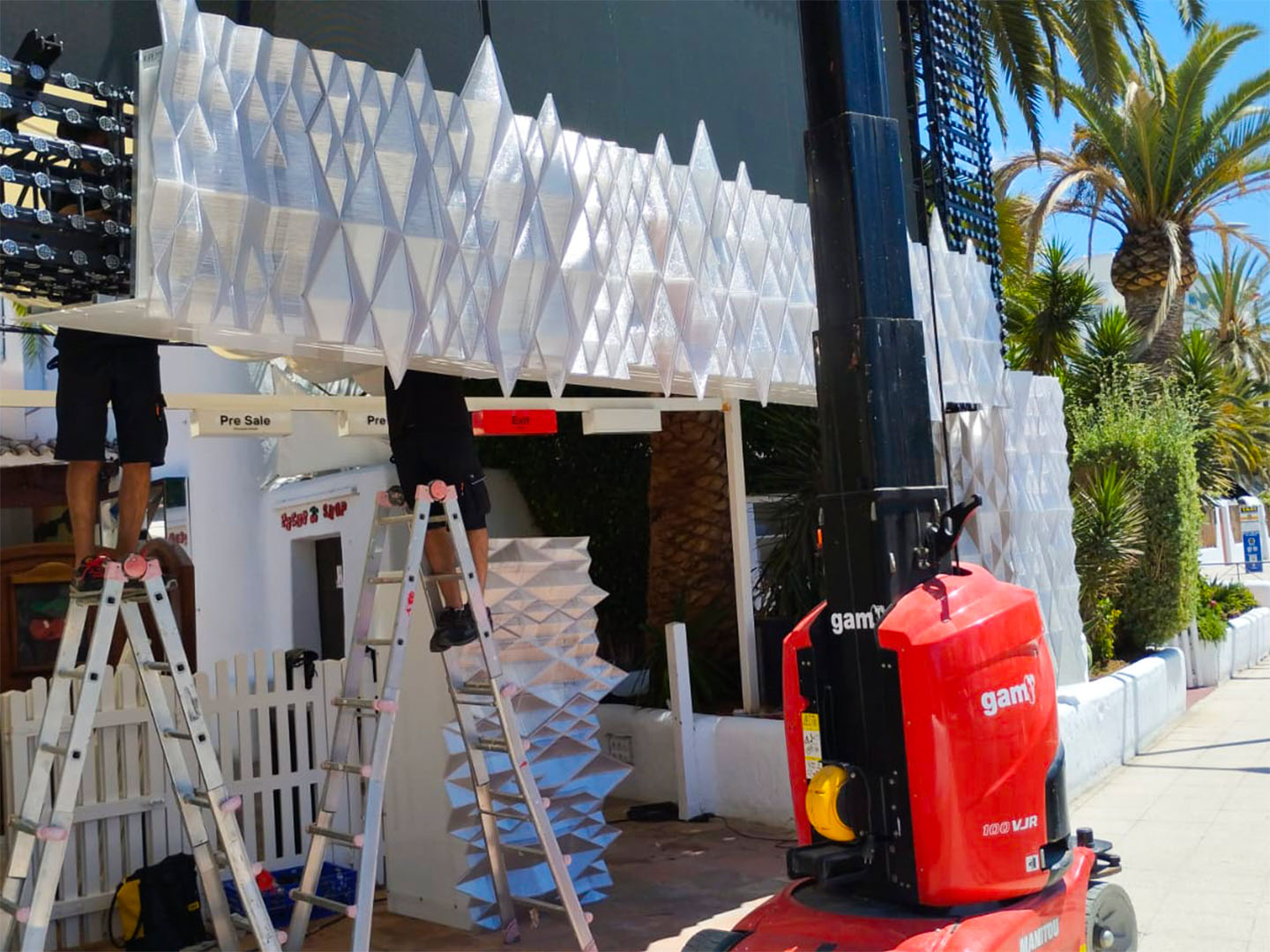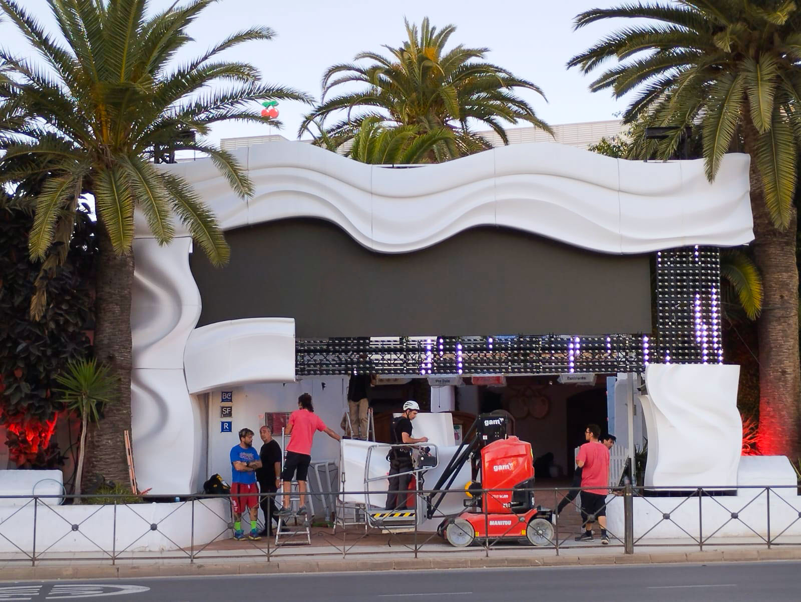 Montagem da fachada impressa em 3D da Pacha Ibiza para a inauguração.