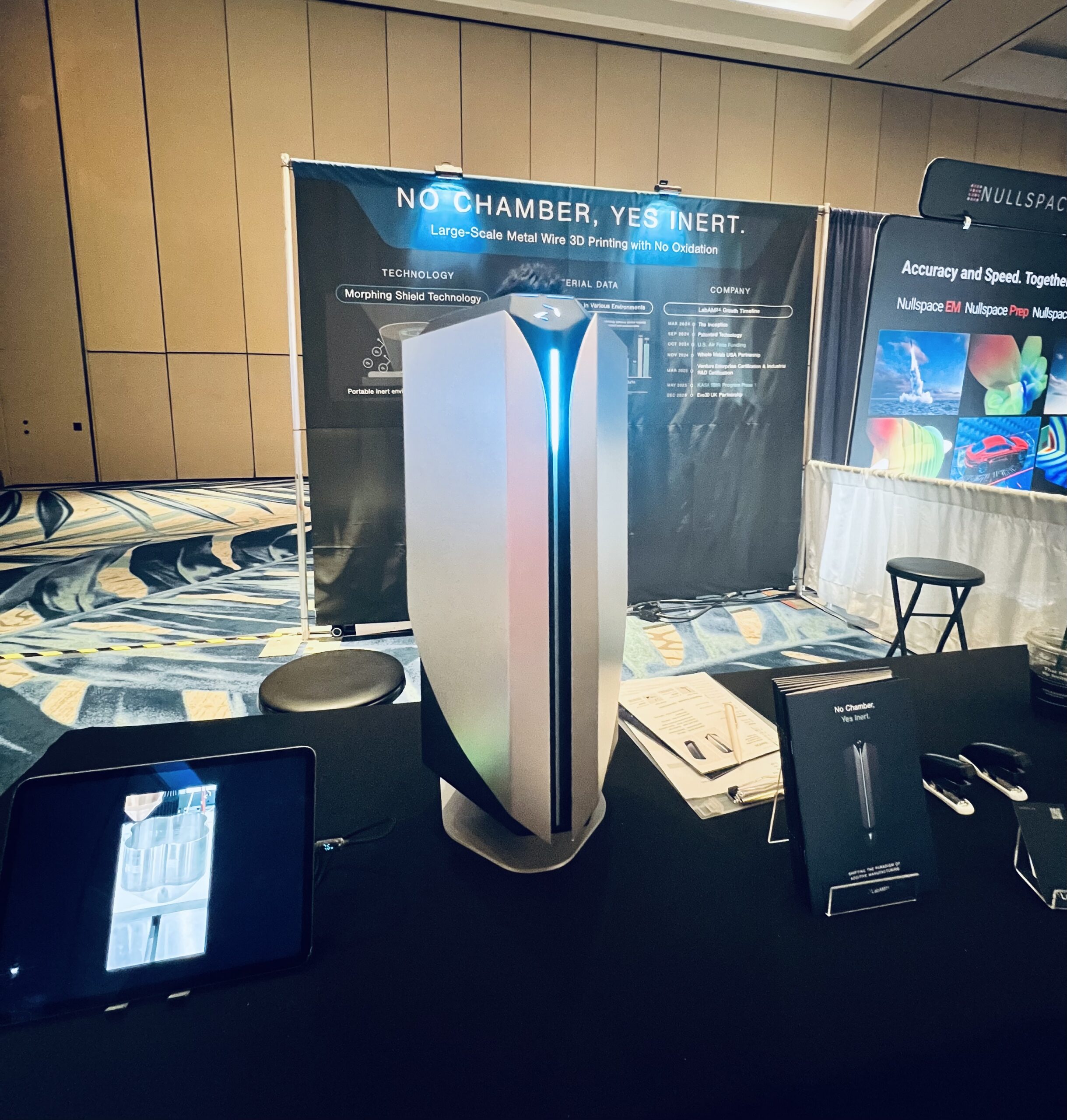 O sistema portátil em exibição no estande do Lab AM 24 no AIAA SciTech Discussion board 2026. Imagem cortesia de 3DPrint.com.