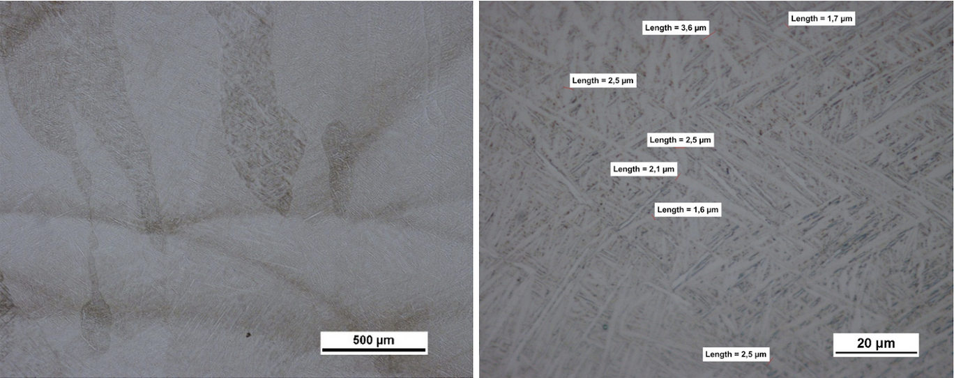 Área da amostra Ti6Al4V Grau 23 observada em 50× (esquerda) e 1000× (direita) sob um microscópio óptico após ataque químico. Imagem cortesia de Meltio.