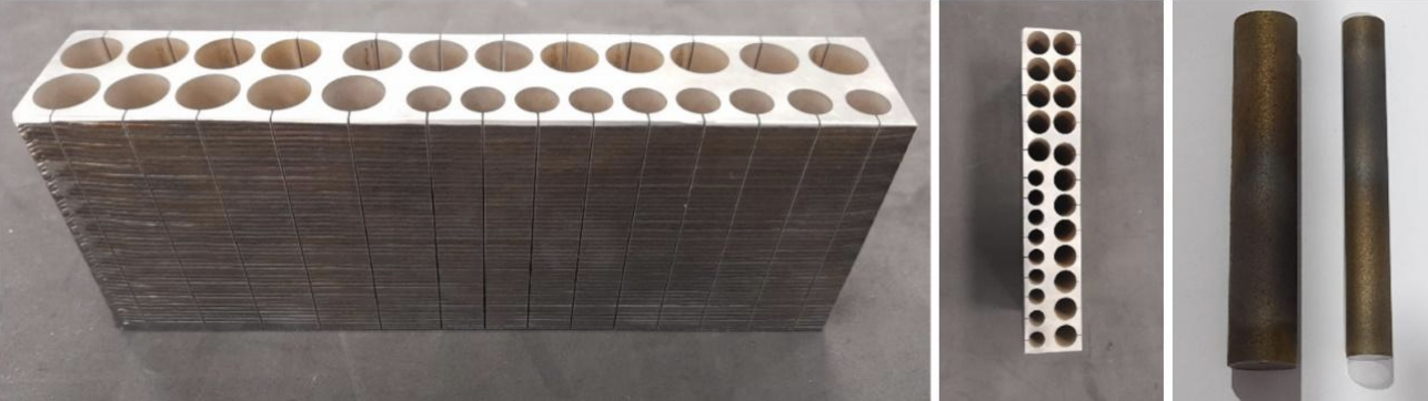 Bloco feito de Ti6Al4V G23 utilizado para obter in vitro e in vivo amostras, com cilindros extraídos para teste e cortados por fio. Imagem cortesia de Meltio.