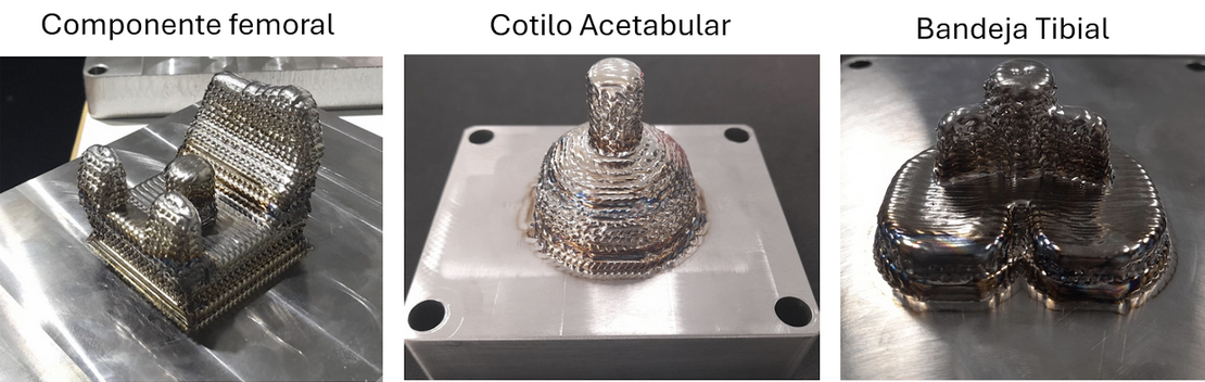 Testes preliminares de implantes de Titânio. À esquerda está o Componente Femoral, seguido pelo copo acetabular e bandeja tibial à direita. Imagem cortesia de Meltio.
